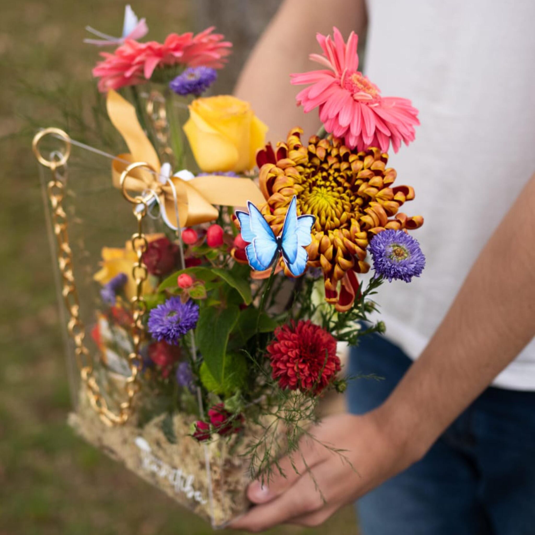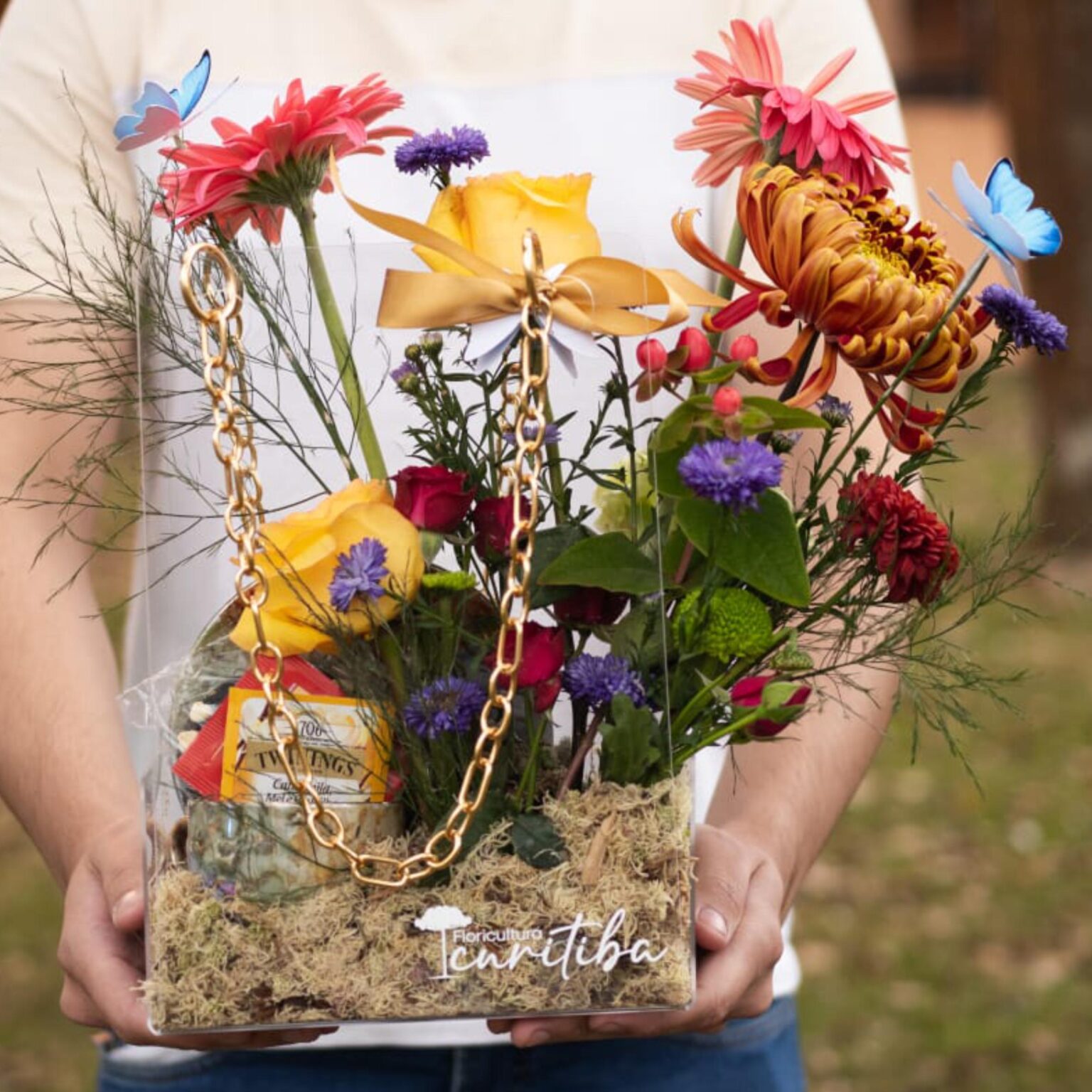Dentro de uma charmosa bolsa em acrílico, cuidadosamente montamos um arranjo de flores delicadas e cheias de vida. Acompanha uma xícara exclusiva, pintada à mão com detalhes em fios de ouro – peça que transmite carinho e elegância. Para completar, um blend especial de chás aromáticos e biscoitinhos temáticos (ou cookie artesanal), criando um momento de pausa, aconchego e sabor.