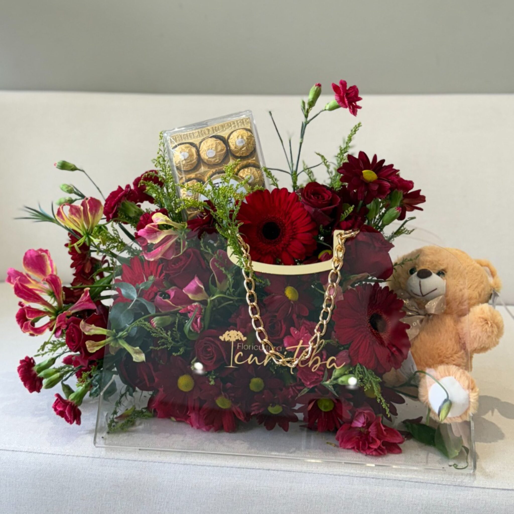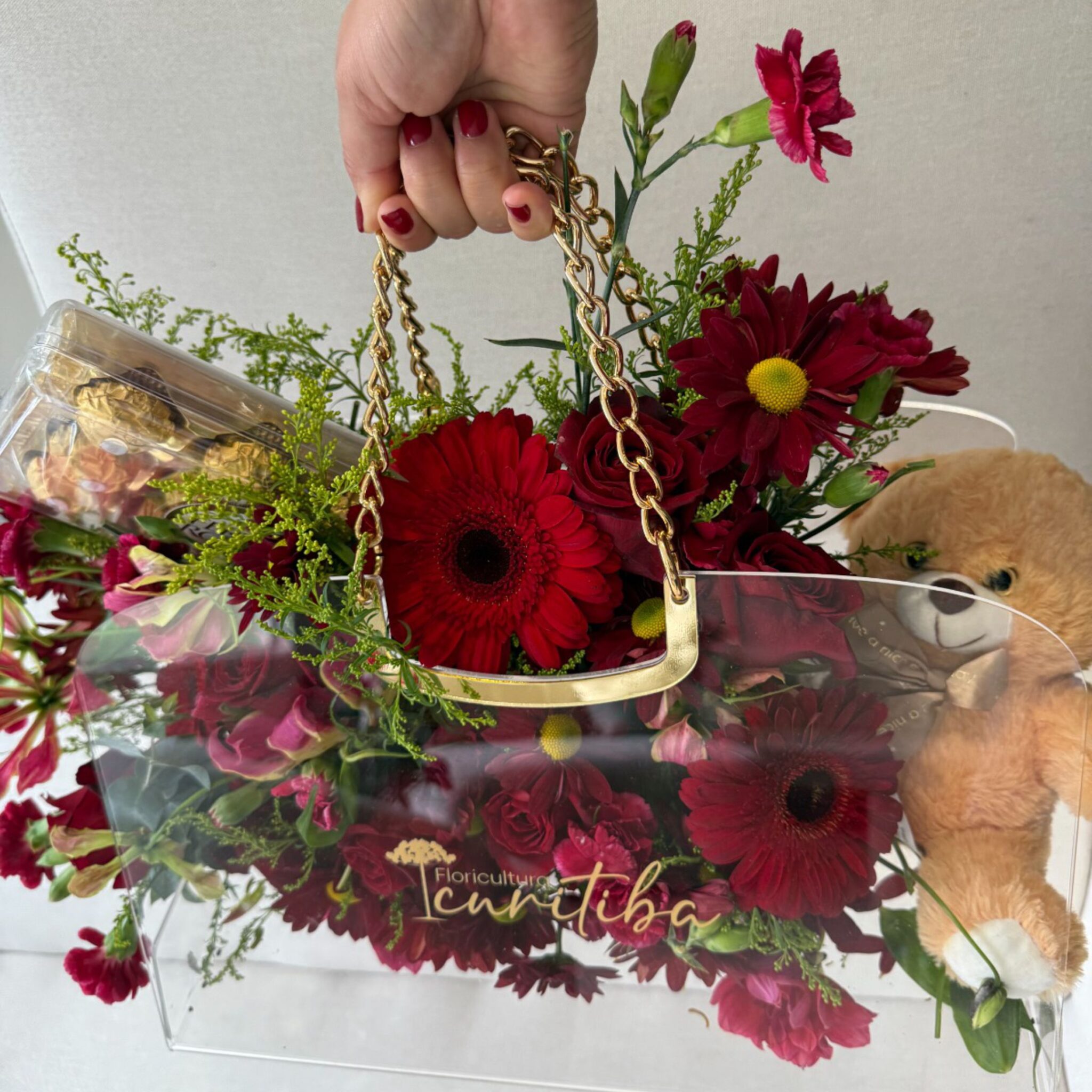Belíssimo Arranjo formado por Rosas, Cravineas, Gérberas, Gloriosa e Tango com um Ursinho de Pelúcia e Bombom Ferreiro Rocher dentro de uma elegante e sofisticada bolsa de acrílico.