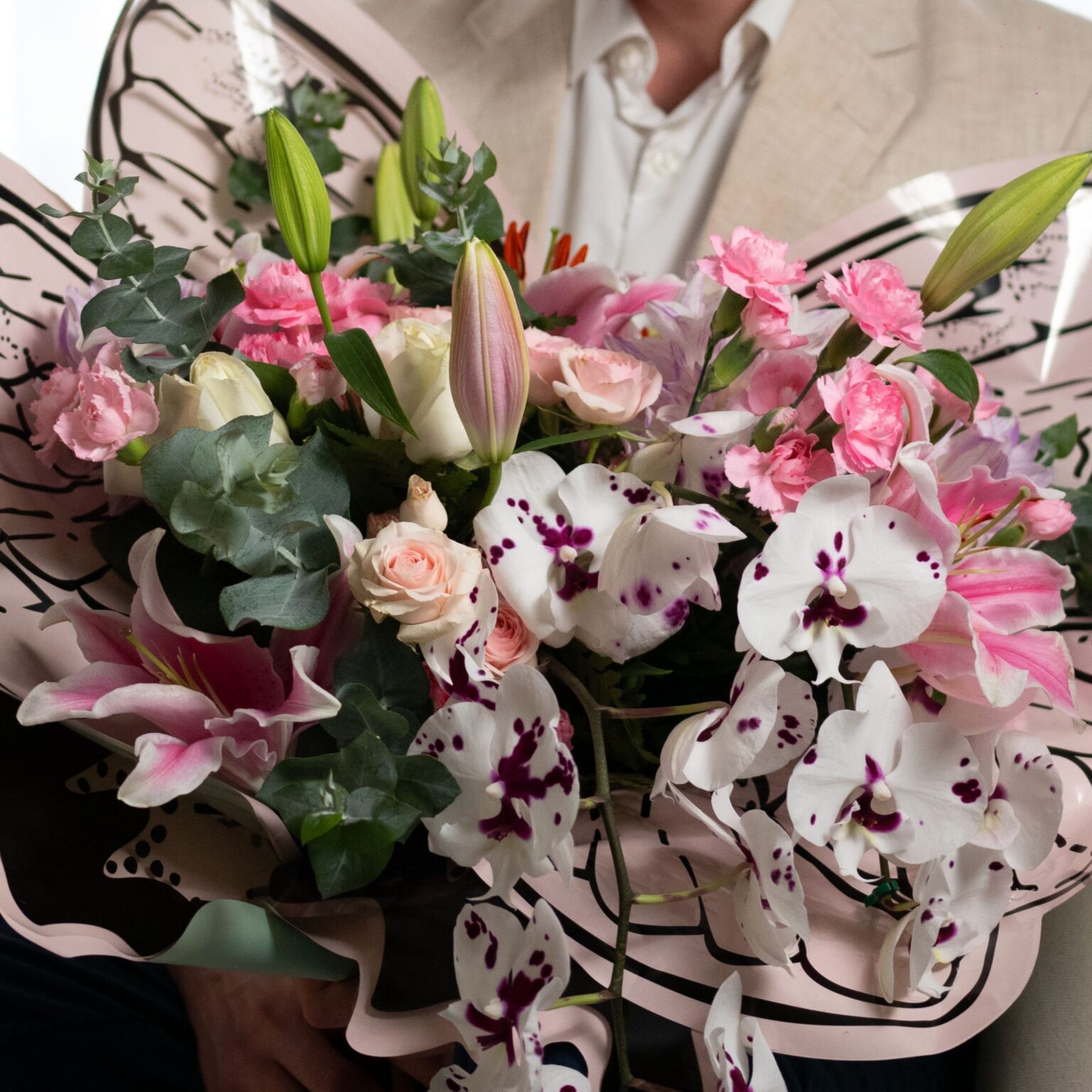 Belíssimo Buquê grande composto de Rosas, Orquídeas, Cravos e Lírios, com embalagem no formato de Borboleta.