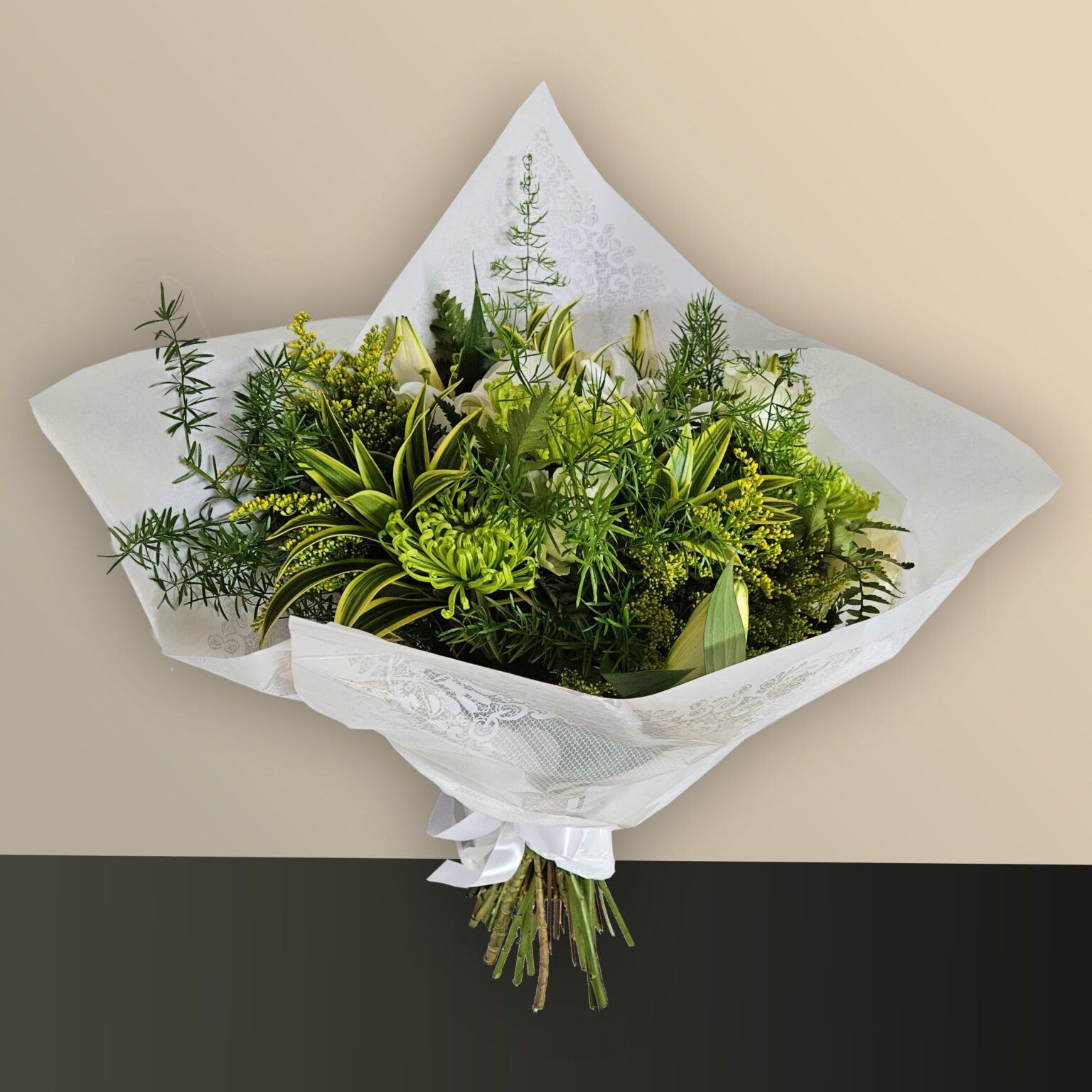 Belíssimo Buquê com Lírios, Aspargos Alfinete, Clorofito, Tango e Crisântemos.