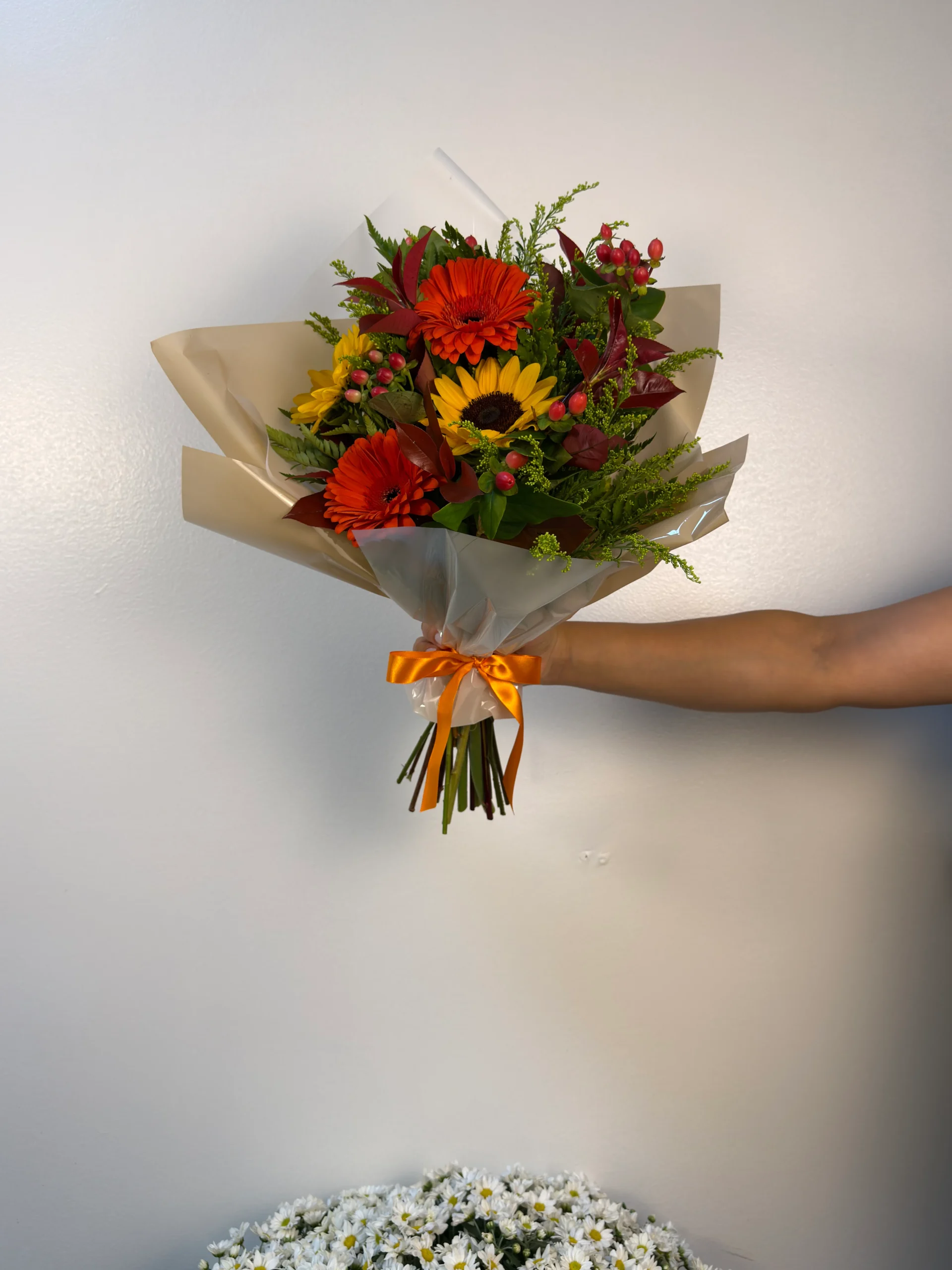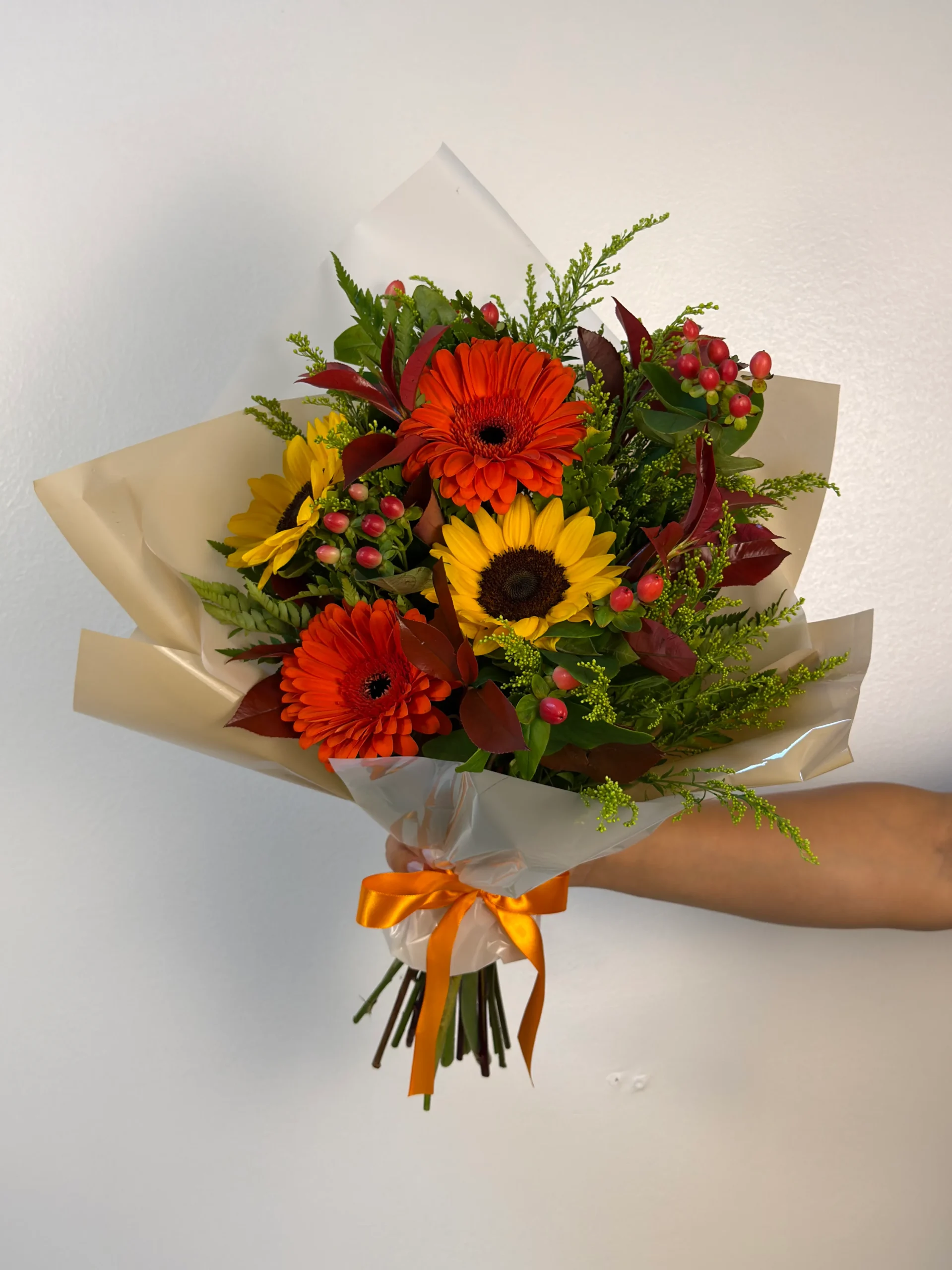 Este buquê reúne a beleza radiante dos girassóis, conhecidos por simbolizar felicidade, vitalidade e positividade, combinados com gérberas em tons quentes de laranja, que trazem intensidade e modernidade ao arranjo. A composição é enriquecida com folhagens verdes e detalhes em tons avermelhados, além de pequenos frutos decorativos, que adicionam textura e um toque especial ao conjunto.