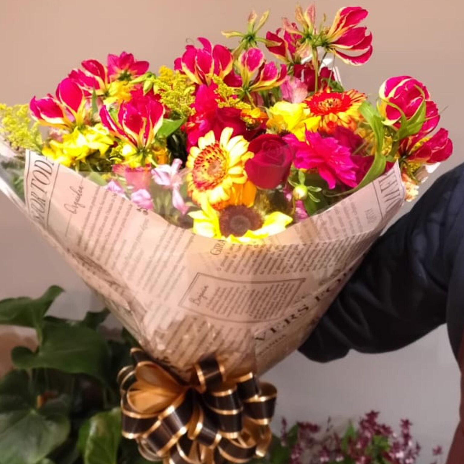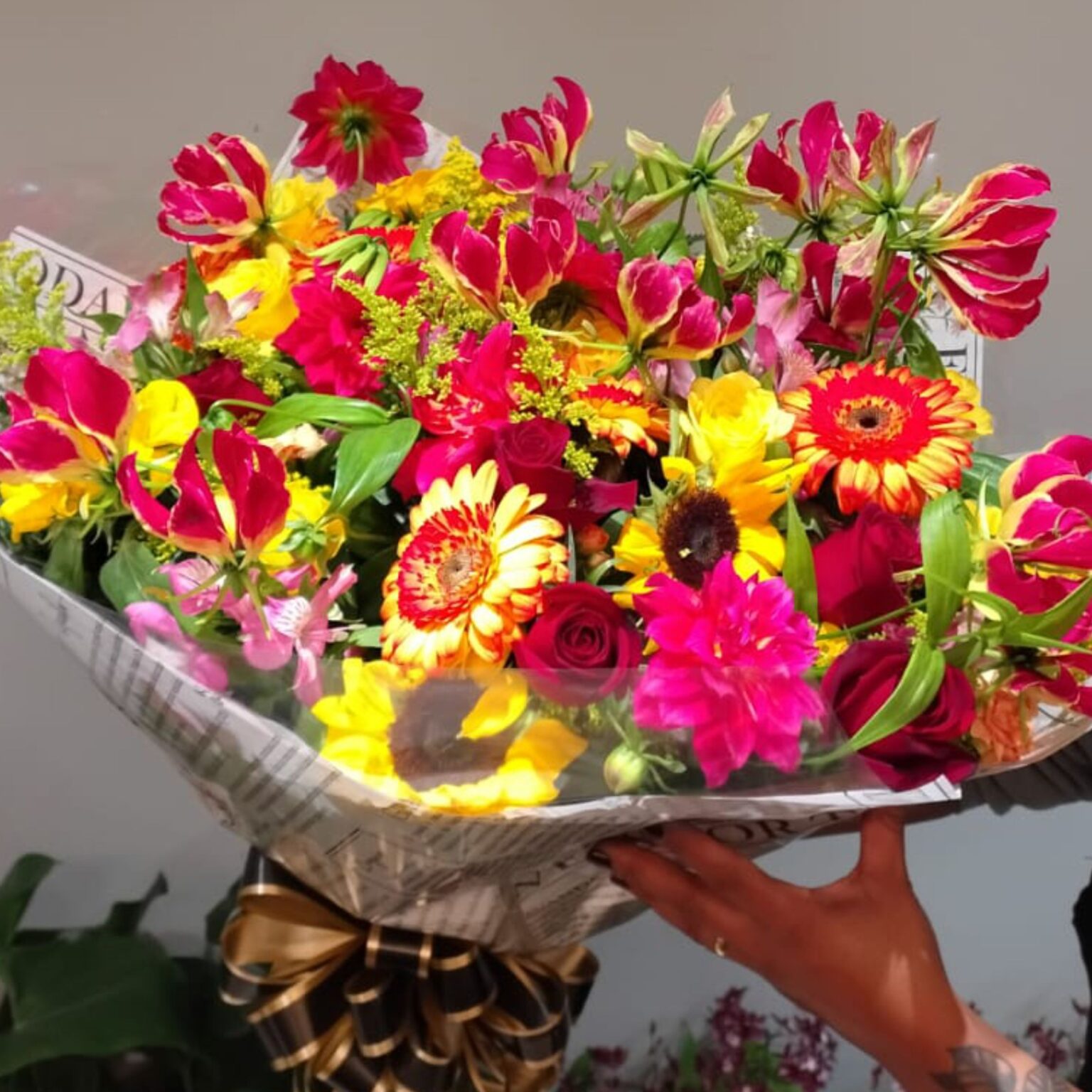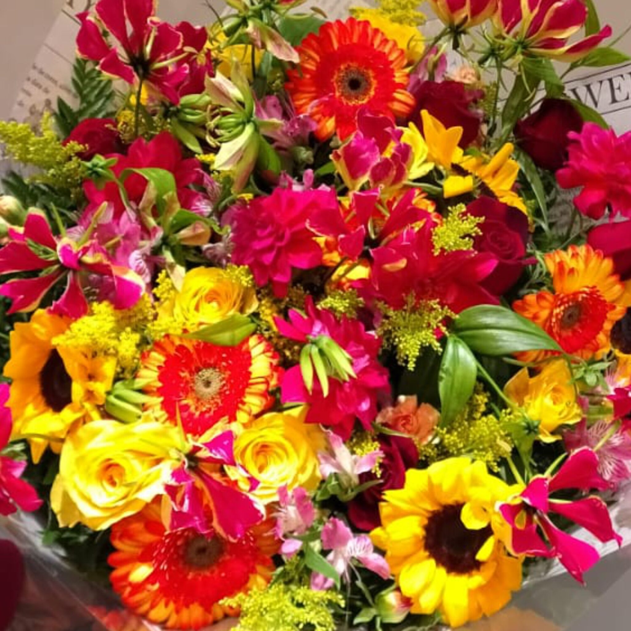 Belíssimo Buquê grande composto de flores com cores vibrantes, alegres, Girassol, Rosas, Gloriosa e delicadas Mini Rosas.