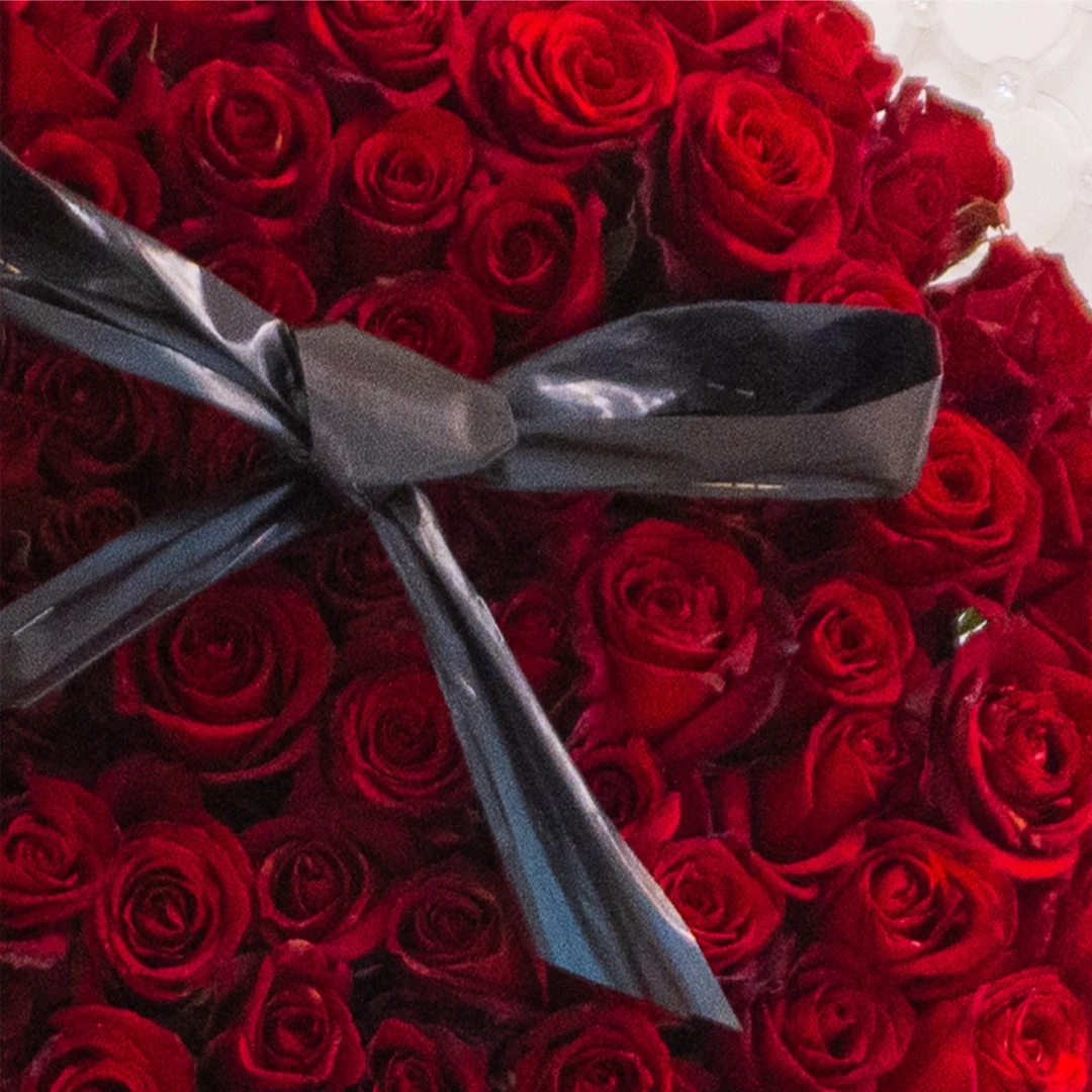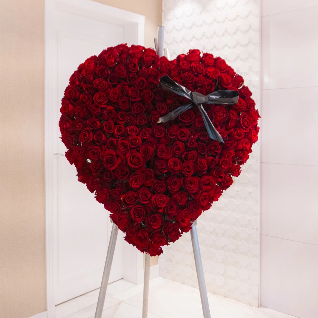 Coroa Amor Eterno em formato de Coração, composta inteiramente de Rosas. Elegância e delicadeza em uma homenagem especial.