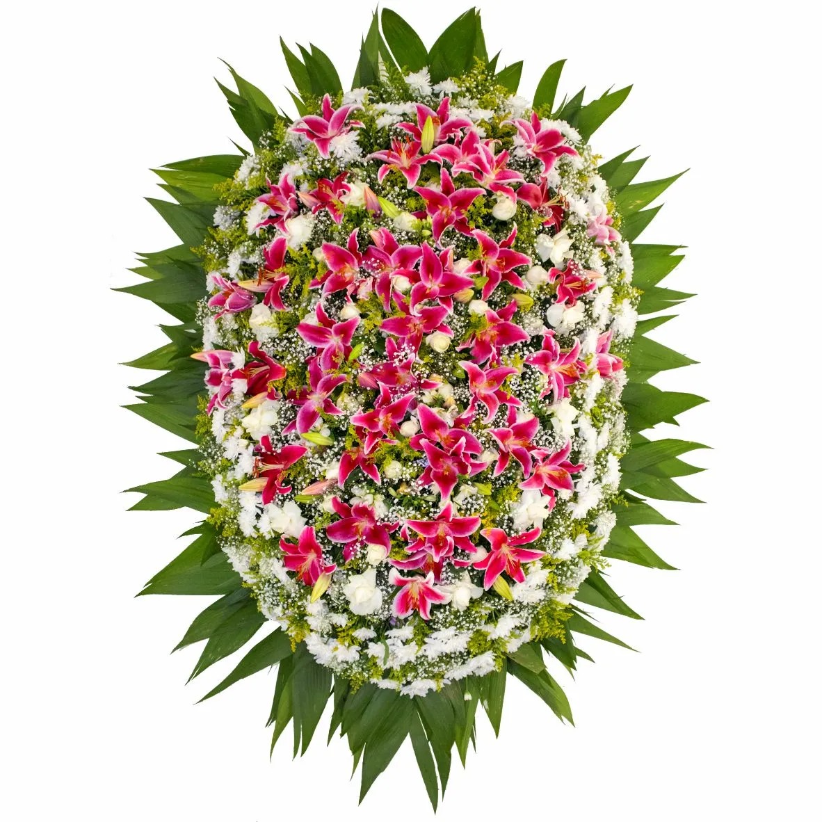 Belíssima Coroa de Rosas, Astromélias, Crisântemos e Antúrios ou Lírios.