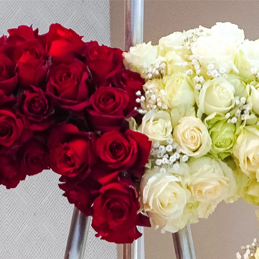 Coroa Dual Heart composta inteiramente de Rosas Brancas e Rosas Champagne. Elegância e delicadeza em uma homenagem especial.
