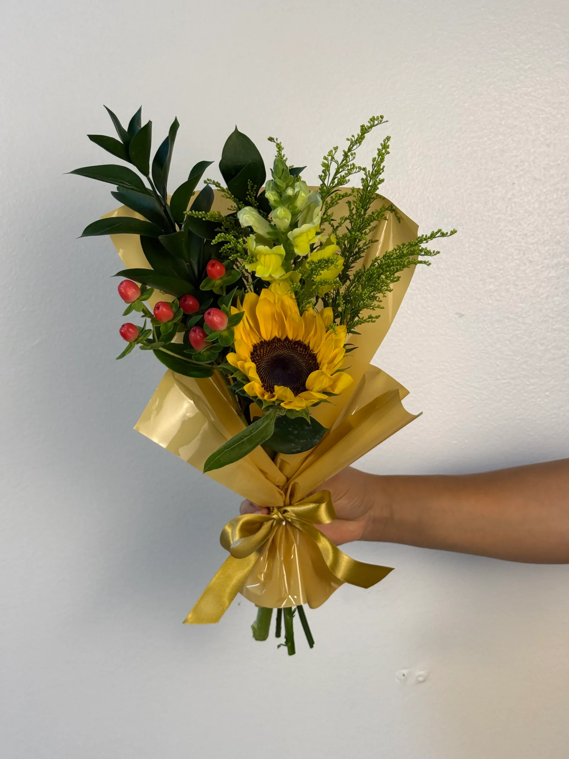 Um delicado ramalhete composto por girassol, flores amarelas complementares, folhagens verdes e detalhes naturais, envolto em elegante embalagem dourada e finalizado com laço acetinado. Um arranjo alegre e cheio de energia.